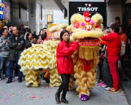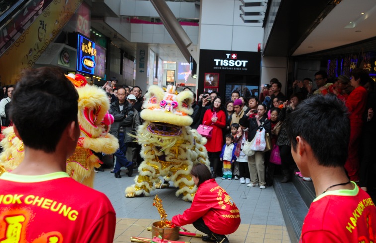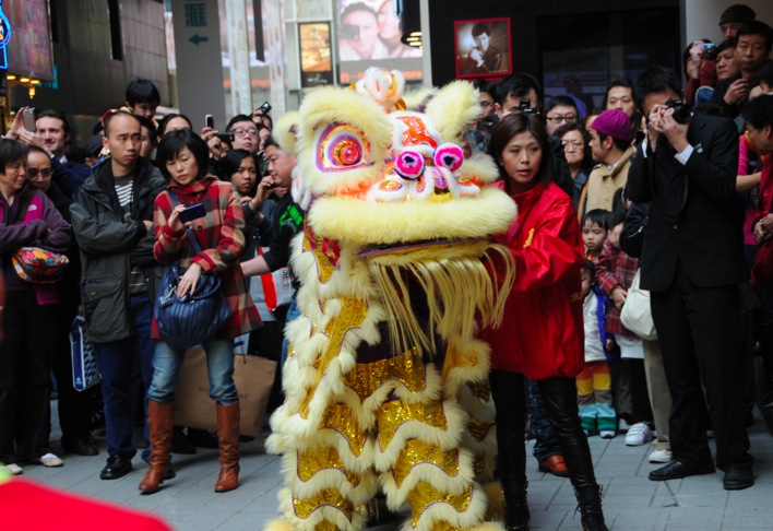 Lion dances are really popular in Hong Kong – not only to Chinese New Year, but actually every big business/company will have a lion dance at its opening or anniversary. Lion dances signify good luck.