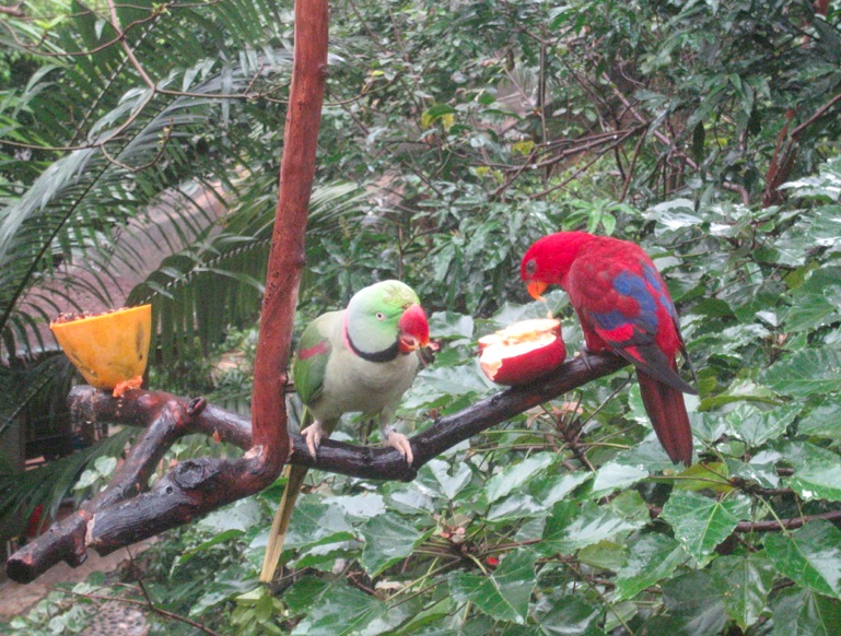 The birds are sitting in the trees, some are eating the fruits that have been put out for them (clearly, their favourites are papaya and apple) and others are just watching the people (hardly any on Saturday) walking through the aviary. It’s very interesting, a lovely lush green atmosphere, with hundreds of birds in the brightest colours.