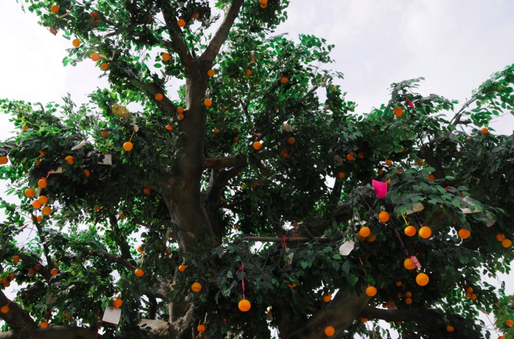 We walked through the rows of branches with tangerines and we came to another tree. This tree was fake too, but people had thrown tangerines on ropes, with wishes on a pink letter attached, over the branches of the tree.