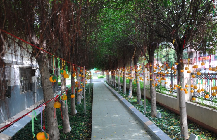 After we visited the real and old Wishing Tree, we walked around the little village and visited the little temple. On our way back to the car we noticed an interesting alley with small trees and branches lined up next to it – to which rows of tangerines were attached.