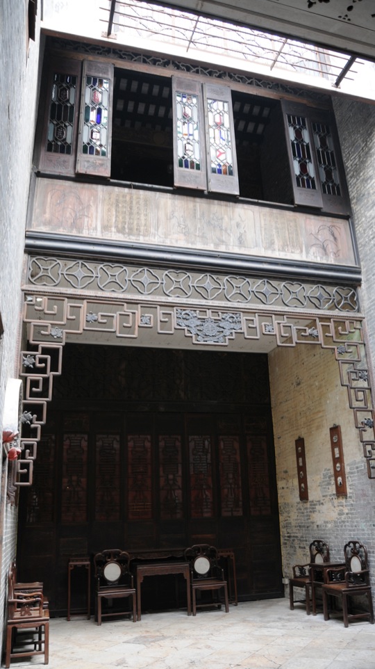 Lou Kau Mansion is a two-storey, traditional grey-brick courtyard house, with the architectural characteristics of a typical Xiguan Chinese residential building. The facade of the house has a recessed entrance, which creates an overhanging eave for weather protection while also providing a shelter for relief frieze decorations above the grand entrance, common in the housing design of the Lingnan region.
