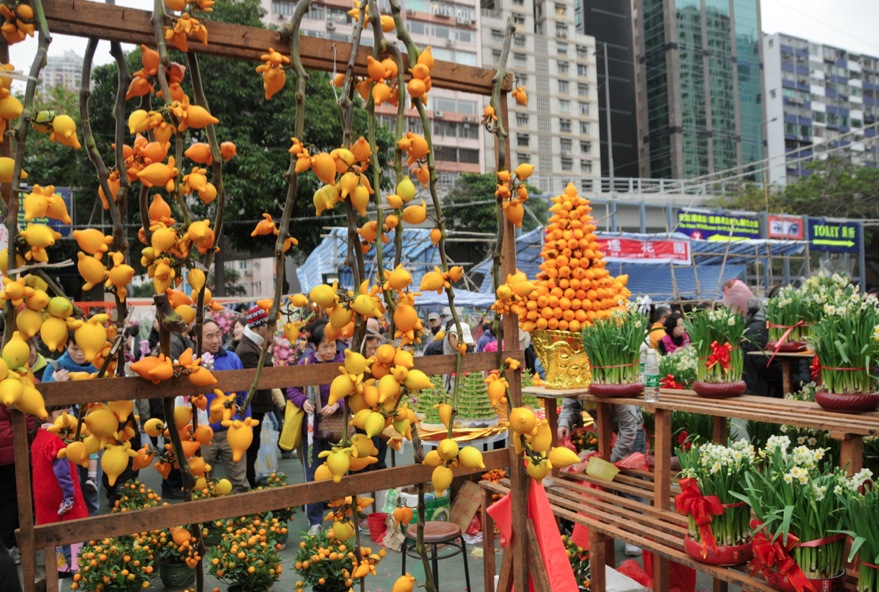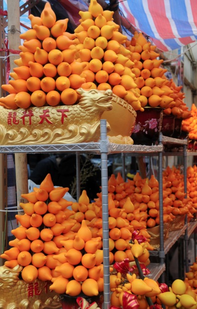 The Chinese New Year equivalent of the Christmas Tree is a tangerine/kumquat tree, with the bright orange fruits believed to bring luck and the tree itself believed to be auspicious for wealth in the new year. Flower markets are stacked with them.
