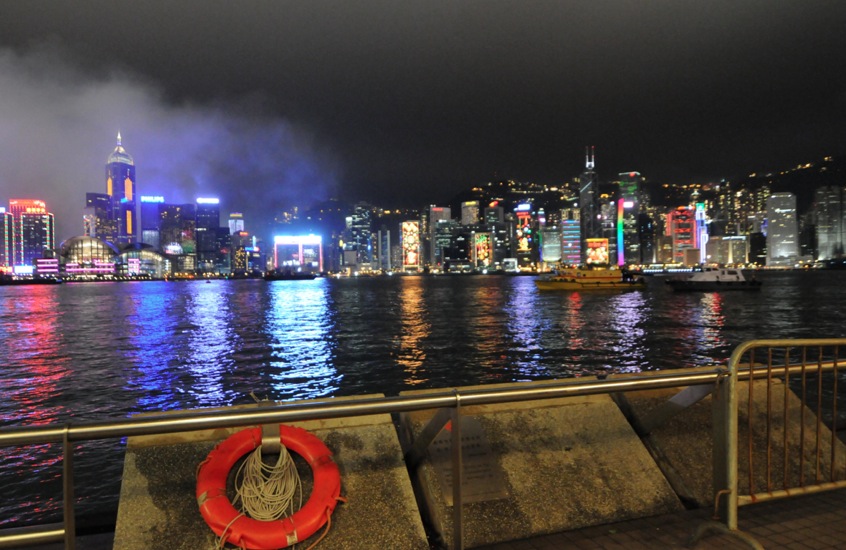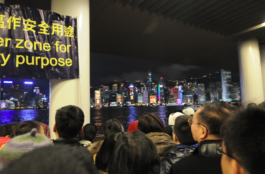 Everyone wants to go and see the fireworks display, so you have to queue up hours before it starts at 8pm. Unfortunately it was raining on Tuesday, so we could only queue up an hour beforehand and had to find a spot that’s protected from the weather. We stood underneath the viewing platform in front of the Hong Kong Cultural Centre in Tsim Sha Tsui (it has two levels, so we were on the lower level) and it kept us sheltered from wind an rain. However, it also meant that our view was overshadowed by the roof of the viewing platform, we could only see 3/4 of the sky.