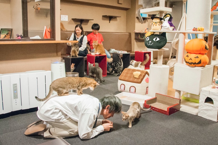There was one guy specifically who seemed to connect with the cats immediately and he knew them by their names. He bought some cat food and of course, suddenly all the cats were coming to him. It was nice to watch him play with the cats, some even jumping on his back when he was crawling on all fours – but also a little sad. I’ve read a lot that in an increasingly childless and aging nation, cat cafes fill a void. The more fortunate Japanese might have enough space to own a dog and maybe someone looking after their pet. For those who live with long work hours, no-pet apartments and work-related travel, there are cat cafes.