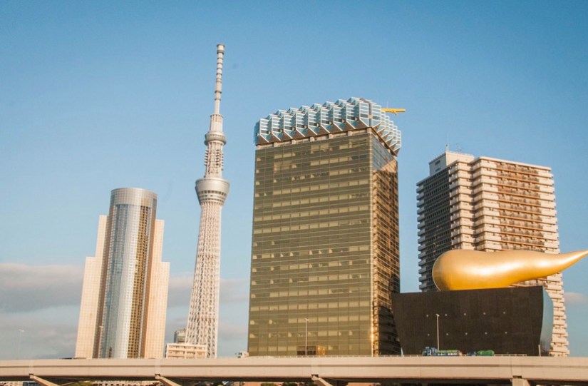A building that made me chuckle is the Asahi beer headquarters located on the Sumida River. Its top resembles a factory flame, but it looks more like a flaming bean to me.