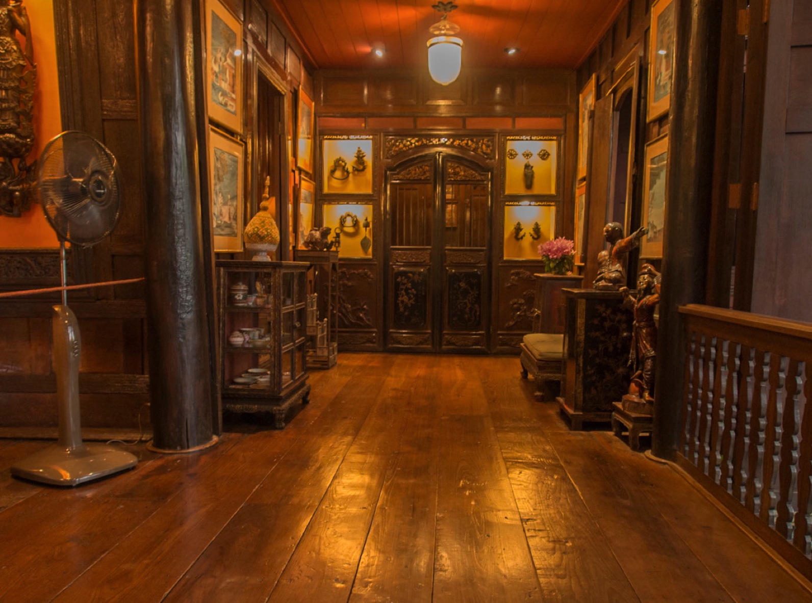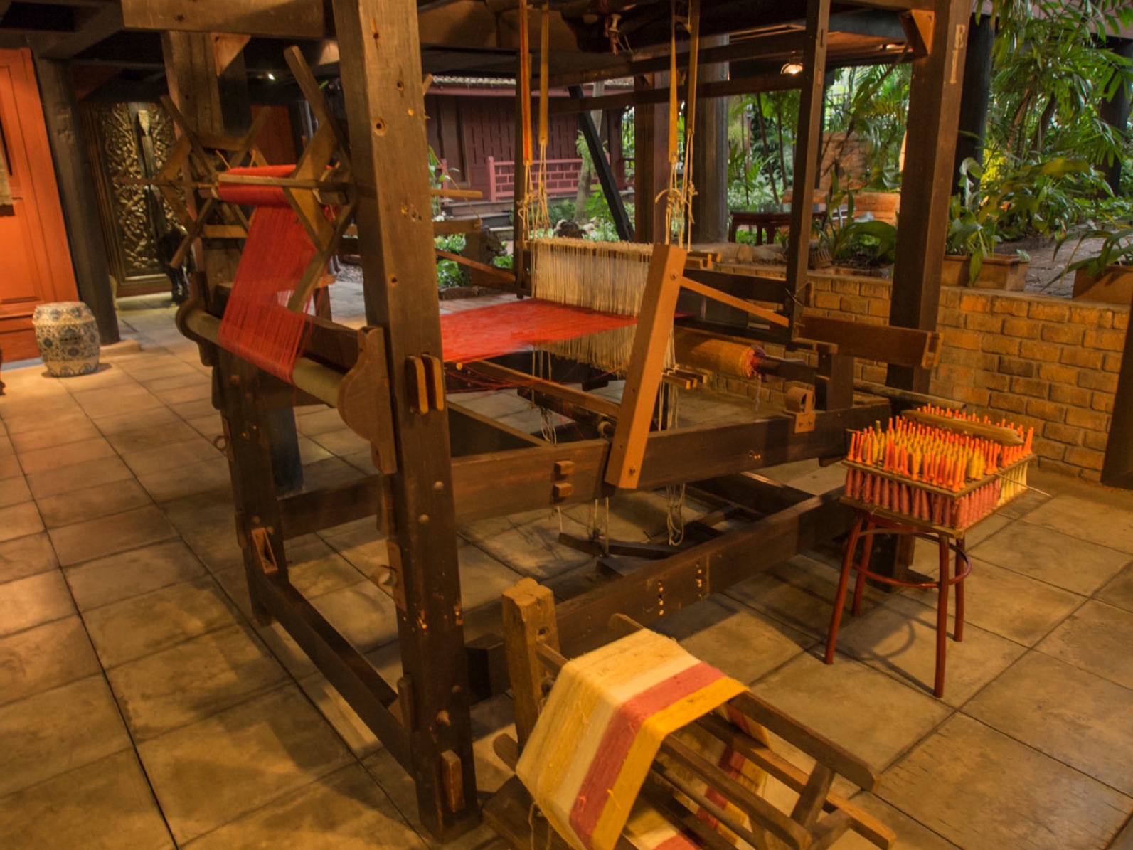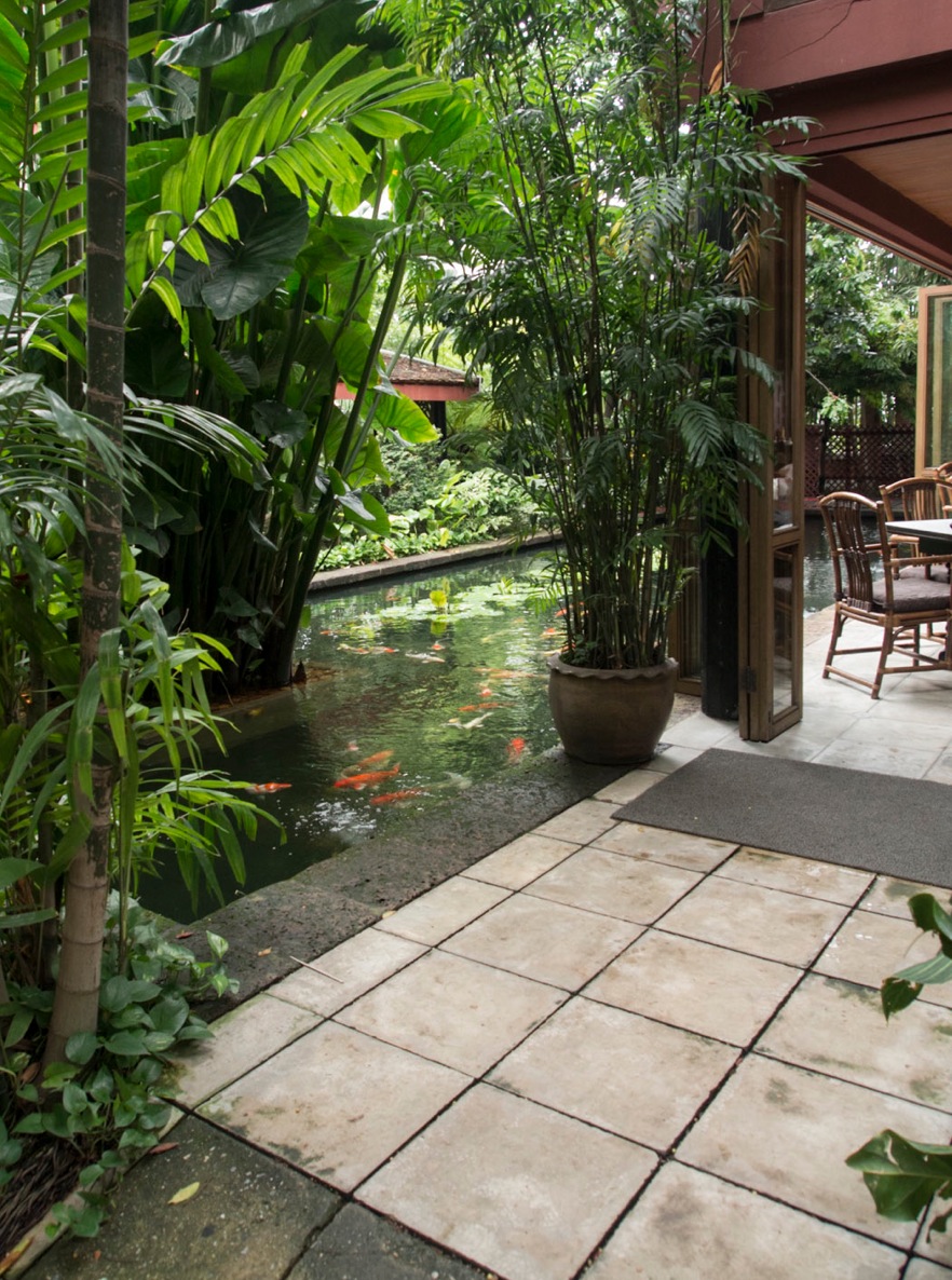 An especially appealing feature of the house is the lush tropical garden. A stroll through it quickly removes one from the bustle and noise of urban Bangkok. In one corner, the gardener’s cottage has been transformed into a room for displaying part of Thompson’s large collection of Thai-style paintings. In another corner can be found the Maid’s room and an interesting selection of porcelain.