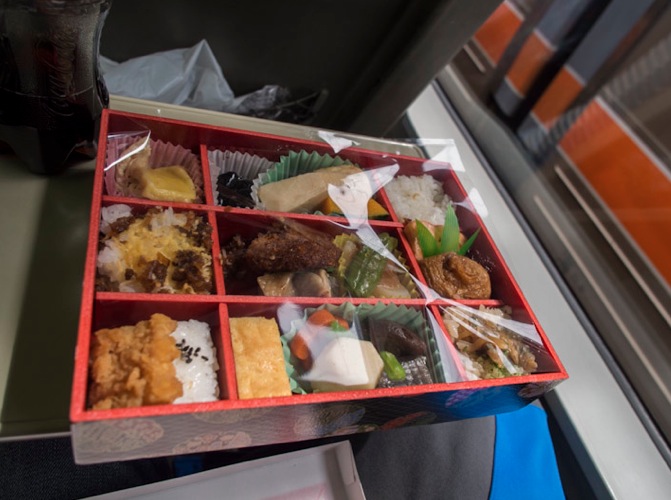We took the 10:56 Shinkansen Hikari 464 from Kyoto Station, which took us in less than 40 minutes to Nagoya. There was hardly enough time for Patrick to unwrap his bento box for a late breakfast/early brunch, but he made it – and enjoyed it.