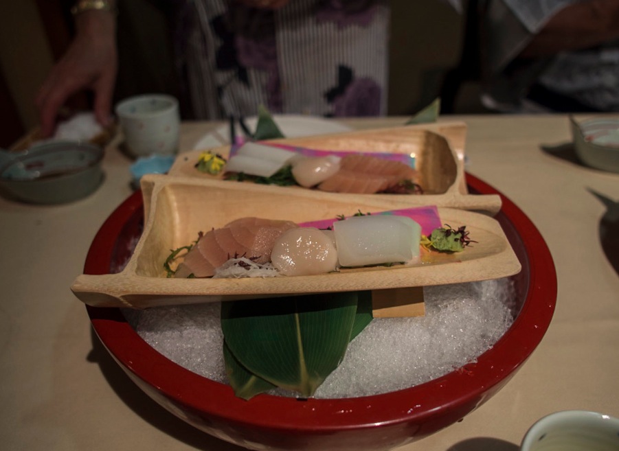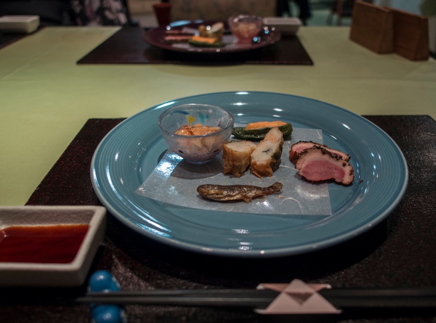 We tried the sansai soba (buckwheat noodles topped with greens) and hoba miso, which are vegetables mixed with miso paste and roasted on a magnolia leaf above a charcoal brazier on the table. I wish I had taken a picture of it, but I did not. Here is just a shot of nice cured meat and the small fish on my plate.