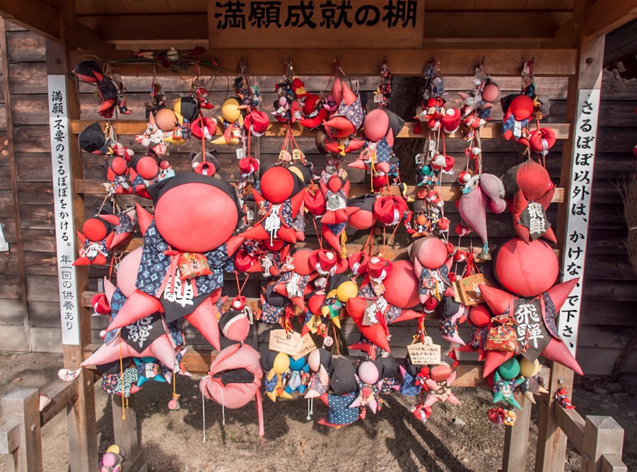 At its entrance are sarubobo dolls tied to a wooden frame. Those are red human-shaped dolls, with no facial features. Traditionally, sarubobos are made by grandmothers for their grandchildren as dolls, and for their daughters as a charm for good marriage, good children and to ensure a well-rounded couple. The sarubobo is associated with three wishes, protection from bad things, a good home and an easy childbirth.