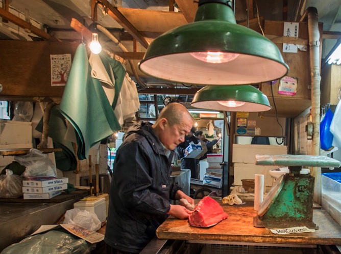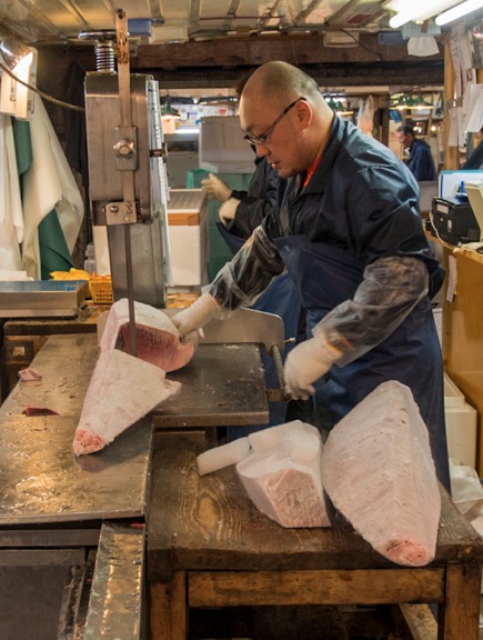 Some traders then cut the tuna meat into smaller pieces – depending on what their customers ordered. It was fascinating to watch the traders cut the meat, they all took their job very seriously and administered a lot of care. They lovingly touched each piece of meat, deciding carefully at what angle to cut it, before they made their first move with the knife.