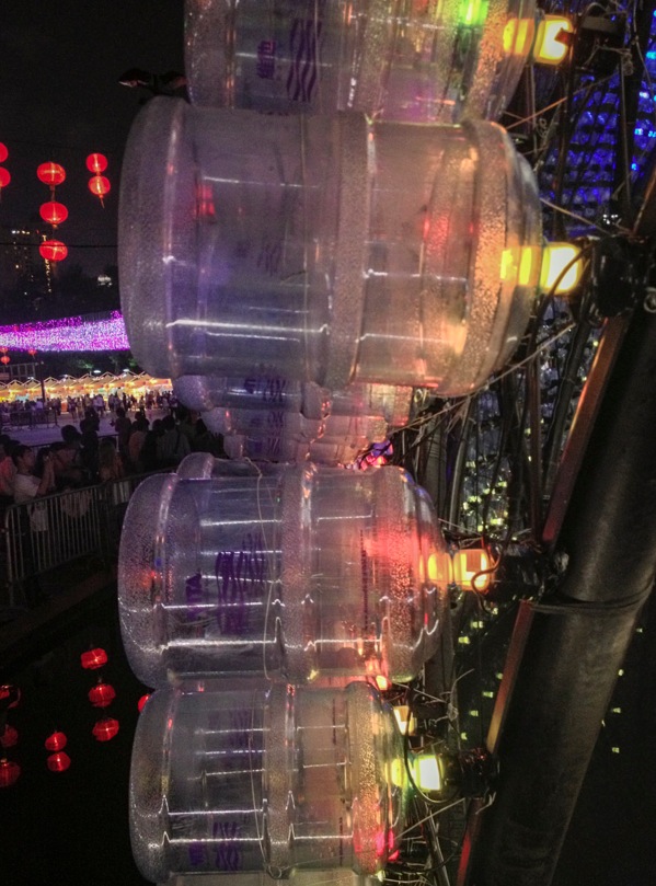 It is a very clever design, featuring water bottles and LED lights, by four young architectural designers, Mr. Siu Kwok Kin Stanley, Mr. Chan Pui Hong Aden, Mr. Hui Chun Hoi Eddie and Mr. He Yiteng, whose design won the Gold Award in the Lantern Wonderland Design Competition.
