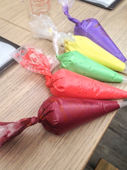 Then, we filled the macaron dough into piping bags… just look how colorful they are!