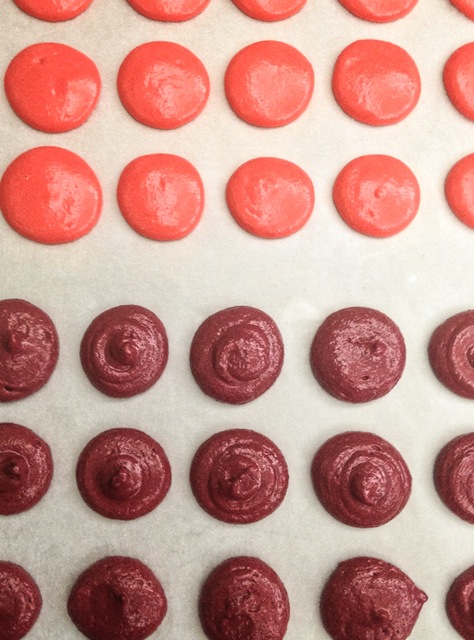 We immediately got started, beating egg whites, adding sugar, beating it more – and then for the fun part, we added food colour.