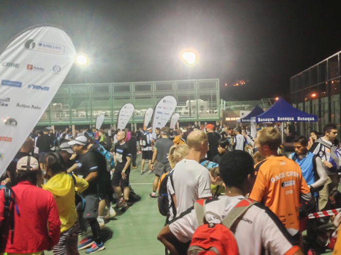 The race starts at 9.00pm for the 40km route and at 11.20pm for the 27km hike. For both races, the starting point is the football pitch at Mui Wo. This is where all the volunteers meet, to pick up the supplies for the night. I arrived at 9.45pm so the first group of racers was already underway. The second group was just gathering for the start and it was an amazing atmosphere, lots of cheers and words of encouragements were shared.