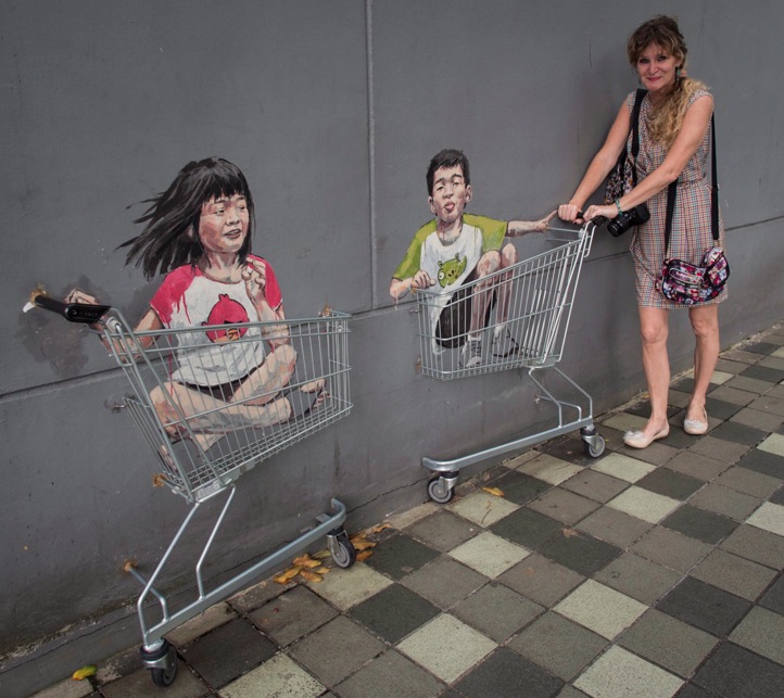Second one, a girl and a boy on shopping carts (also by Ernest Zacharevic) and Anja is interacting with it nicely – that’s the fun part that some murals are not just painted on the walls, but actually interactive!