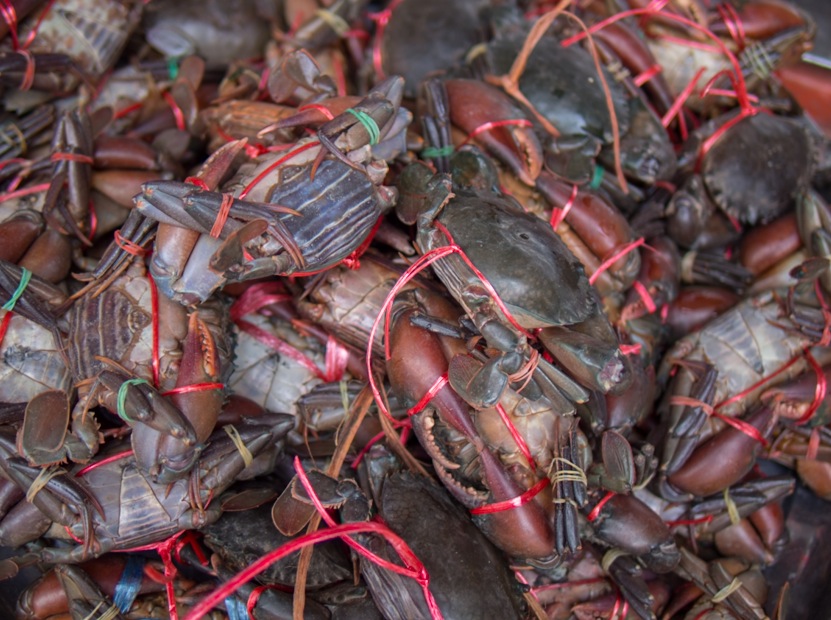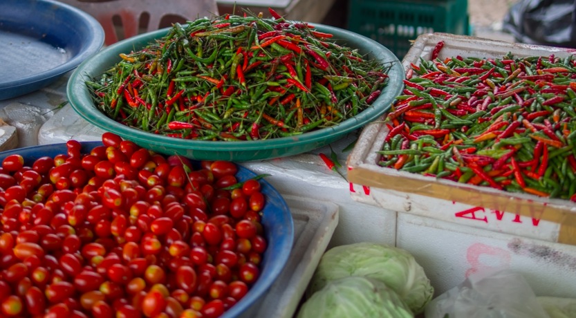 Locals gather around the stalls selling local produce and bargain over fresh fruit, vegetables, meat and seafood.