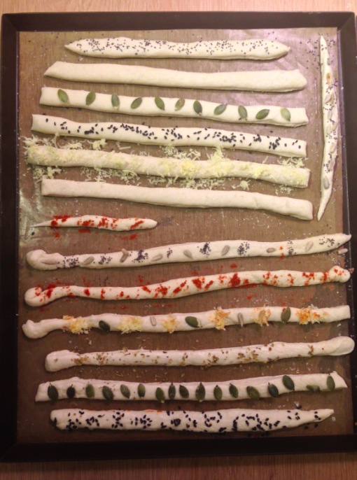 Ok, bread one was ready to bake. Next up, our bread sticks. The dough was ready, we just needed to roll the sticks and arrange them on a baking tray – the easiest part was then to pick the seasoning for our sticks. Kyle offered us a range of different topics including sea salt, paprika, sunflower seeds, black pepper and herbs – but the one that I liked best in the end was parmesan cheese!