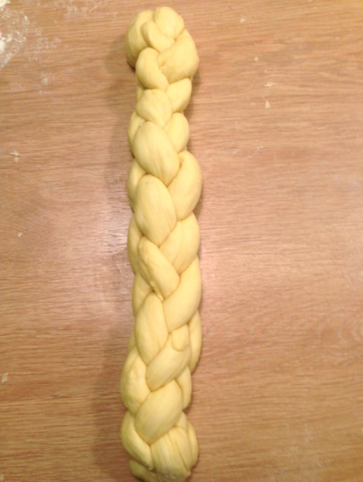 …cutting the dough in equal parts, forming four equal-sized strands (not as easy as it sounds) and then plaiting it.