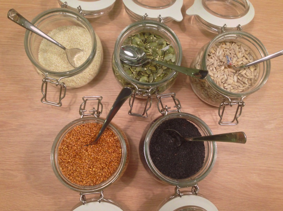 Finally, the seeded loaf had risen – which at this point was not yet seeded. So we had to add our seeds. Again, we were free to choose. I added flaxseed, sunflower seeds and some pumpkin seeds to my bread. Then we mixed everything in with our hands and shaped the bread. We put it into baskets so it would get the right form.