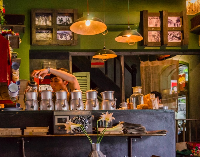Cộng Càphês are unique in their style, they look like a coffee shop in the olden days might have looked like. The colours are all green and brown, the menus are scrawled on hardback works by Lenin, drinks are served in retro enamel cups and old propaganda posters adorn the walls.