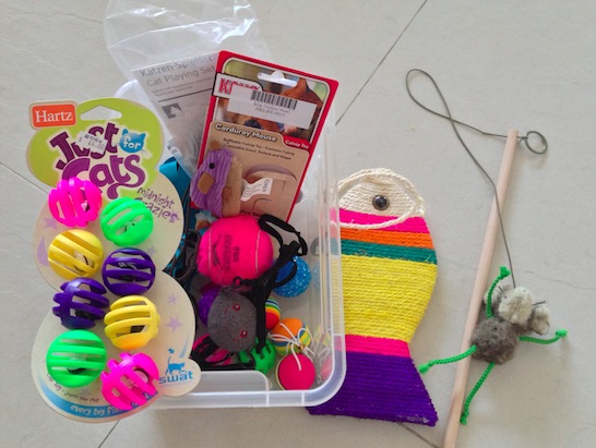 Cats have a strong need to hunt. It is a part of their being, of who they are. Sam loves to chase little balls around the flat and he can either do it by himself, or he waits for someone to throw the ball down the aisle and then he will run, chasing after the balls. He also has a toy mouse that is tied to a shoe lace, so I can pull it away from him or he can also pick it up when it gets stuck under the TV bank (he figured out how to pull on the shoe lace to get his beloved toy back). Here are a few toys that you can easily order online, I’ve got a few mice and balls from PetProject, and Sam really enjoys them.