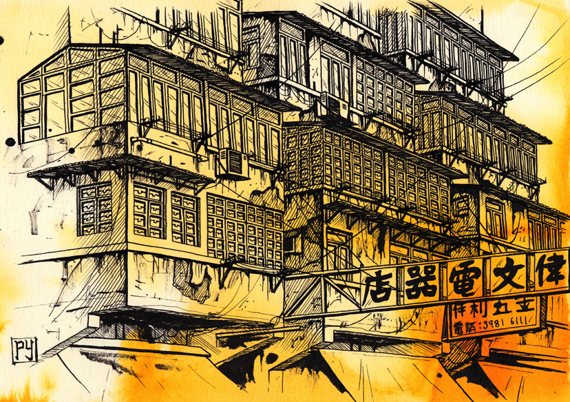I love how he combines black ink with watercolour – and he draws the most amazing, precise buildings. Interestingly, there are no people on his images, no signs of everyday life – which is actually the exact opposite to what you would expect from Hong Kong.