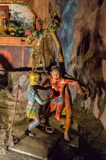 There is also the famous Ten Courts of Hell. According to Chinese mythology, a soul must pass through ten courts of judgment, before being allowed into heaven, and Haw Par Villa has very detailed representations of these trials. As you’re about to see, they are not pretty.