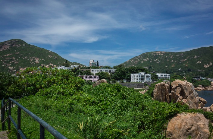 Following that small village road, you arrive at an area of big posh houses – keep walking. If you stay on your right, you come to the dead end of the Shek O Headland Road. To your left is a big massive house which features some Chinese temple elements – and even if it does not look that way, keep walking and at the left side of the building is a staircase that leads to the blue bridge.