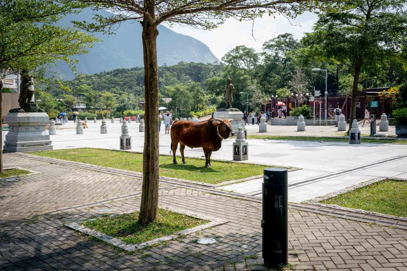 We made our way through the souvenir area and walked towards Po Lin Monastery. On our way, we were greeted by a few roaming cows, who live up on the hills of Lantau. They are friendly, but of course, the best advice is not to touch them and to leave them alone – that’s what we did, the kids just waved at the cows from a safe distance.